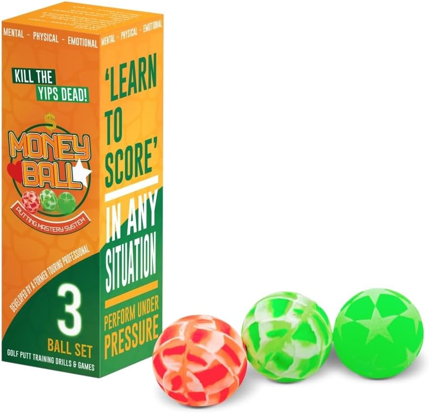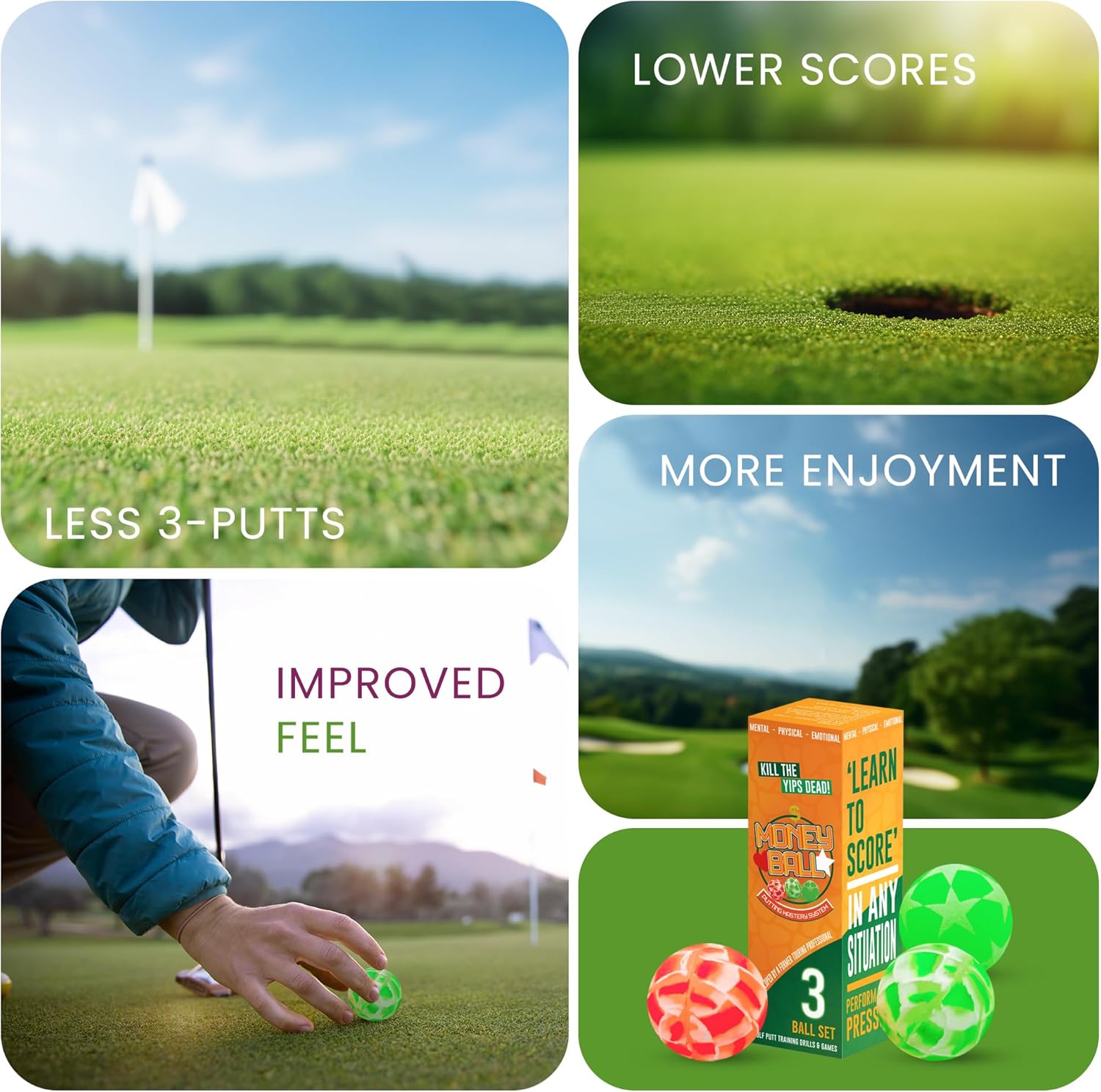 MONEYBALL practice putting balls train golfers to make confident and focused putting strokes, under any type of emotional & mental pressure. Do you struggle with shaky knees or hands when putting under pressure? Especially on short putts? Have you developed putting yips? The best way past these challenges is through. It’s time to utilize MONEYBALL putting practice drills to practice putting under emotional & mental pressure. Ease your mind through repetition & commitment to your positive putting stroke. MONEYBALL golf training drills train you to commit a smooth, full, & consistent putting stroke by removing the feel & sound of the golf ball strike. The result is a dependable putting stroke under any circumstance, even extreme pressure. MONEYBALL was developed by a professional golfer who understands the challenge of putting successfully under pressure.