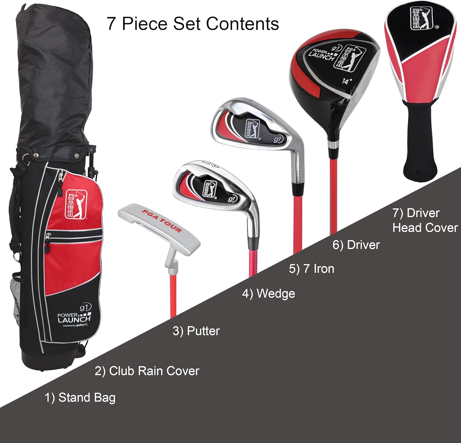 4 Golf Clubs: Driver | 7 Iron | Wedge | Putter 3 Accessories: Driver Head Cover | Lightweight Stand Bag | Stand Bag Rain Cover