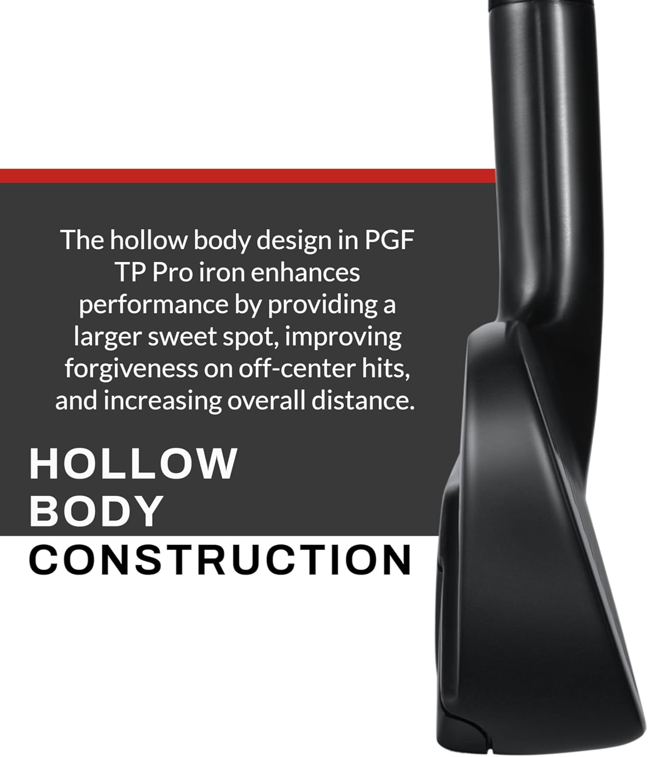 【Hollow Body Construction】The hollow body design in PGF Mustang Pro driving iron enhances performance by providing a larger sweet spot, improving forgiveness on off-center hits, and increasing overall distance. This structure allows for optimal weight distribution, resulting in better launch angles and control, making it easier for players to achieve consistent shots from various lies.