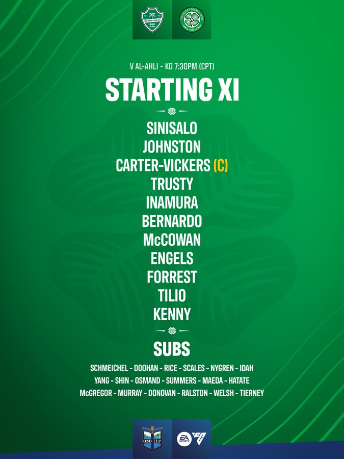 Subs: Schmeichel, Doohan, Rice, Scales, Nygren, Idah, Shin, Osmand, Summers, Maeda, Hatate, McGregor, Murray, Donovan, Ralston, Welsh, Tierney.